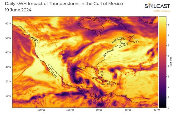 Despite the heatwave, New Mexico saw irradiance 5-10% below typical levels. This deviation was caused by a tropical disturbance in the Gulf of Mexico, which was observed on June 19. This disturbance brought moisture and atmospheric instability, triggering thunderstorms over New Mexico a few days later.