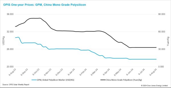 China Mono Grade, OPIS’ assessment for mono-grade polysilicon prices in the country, remained steady at CNY 33/kg ($4.60/kg) this week, marking the tenth consecutive week of stability. China Mono Premium, OPIS’ price assessment for mono-grade polysilicon used for N-type ingot pulling, is reported at CNY 39/kg ($5.44/kg). Sources indicate that Chinese polysilicon manufacturers are still grappling with ongoing production cuts and persistent cash losses.