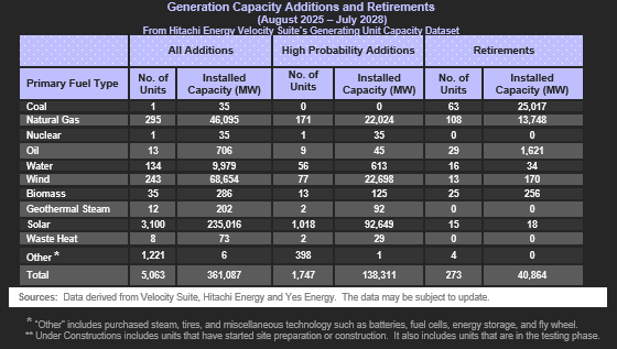 Looking ahead, through July 2028, FERC expects no new coal capacity to come online based on its “high probability additions” forecast. Meanwhile 63 coal plants are expected to be retired, subtracting 25 GW from the 198 GW total, and landing at about 173 GW of coal capacity by 2028. Meanwhile, FERC forecasts 92.6 GW of “high probability additions” solar will come online through July 2028.