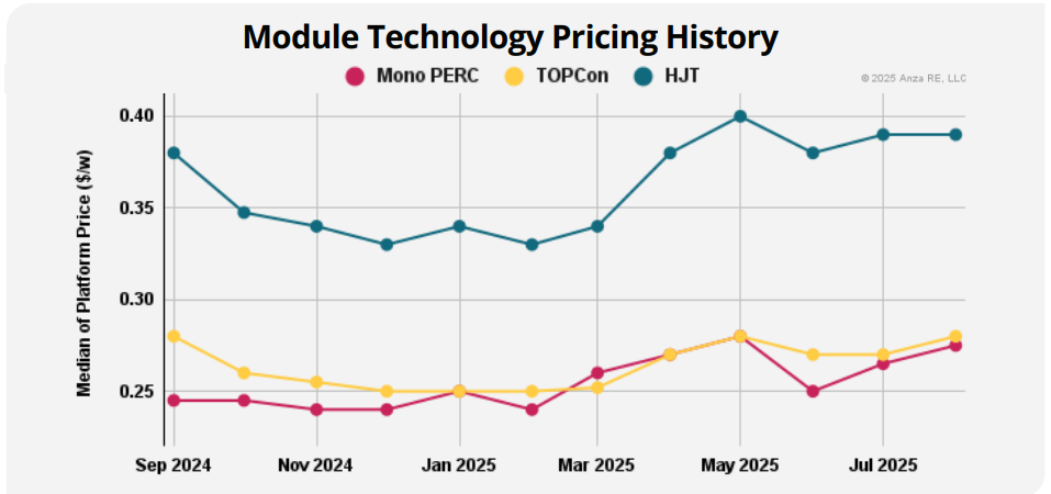 The report said the PERC vs. TOPCon spread compressed to nearly zero, with U.S. suppliers favoring PERC likely due to intellectual property concerns surrounding TOPCon. HJT supply remains limited, with pricing at a premium, said Anza.