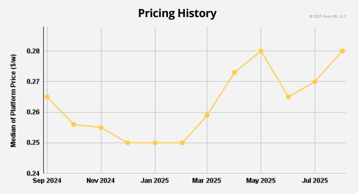 Median Anza platform prices rose 3.7%, or $0.015 per watt from June to August, returning to the May high of $0.28 per watt.