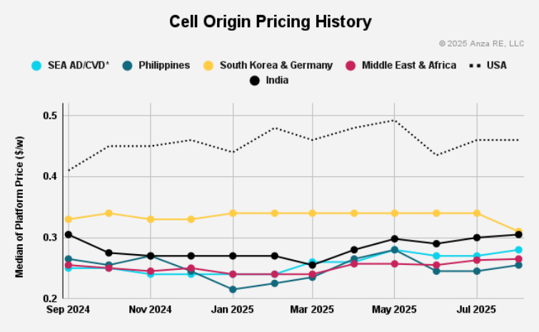 “Looking ahead, pricing trends will depend on factors such as supplier origin strategies, trade actions, and compliance preparations. In particular, anticipated AD/CVD determinations on India, Indonesia, and Laos, as well as a potential Section 232 tariff on polysilicon and its derivatives, could create material upward pressure on module costs in Q4, especially if the polysilicon tariff is applied broadly rather than with limited country exemptions,” said Anza.