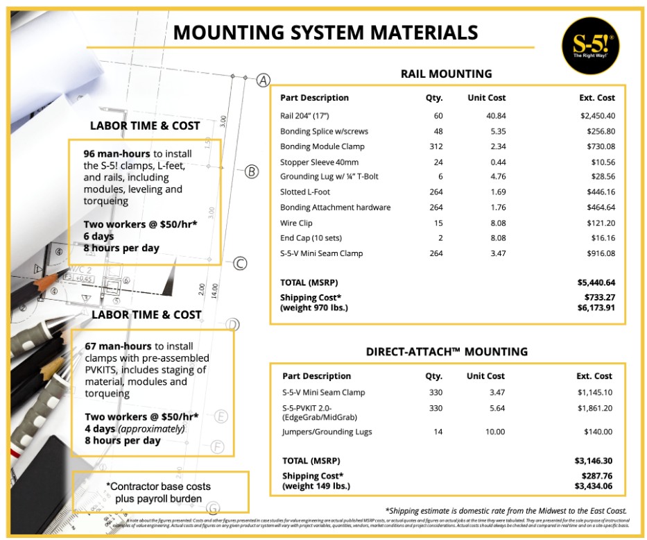 S-5! reports that its rail-less “Direct Attach” mounting system uses 674 components and costs $3,434.06. A comparable railed system requires 1,259 components and costs $6,173.91 delivered. The company estimates that installers can save 29 labor hours, worth about $1,450 at $50 per hour, by eliminating 585 parts. Combined, the labor and hardware savings amount to roughly 8.3 cents per watt.