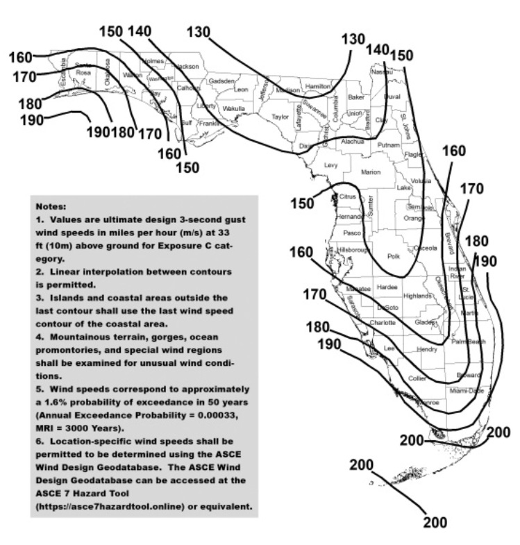 Under Section 1616 of the Florida building code, HVHZ design requirements are based on three-second gust wind speeds that vary by county, distance from the coast, building type, and occupancy category. The highest design wind speeds for the state’s two most populous counties are as follows: