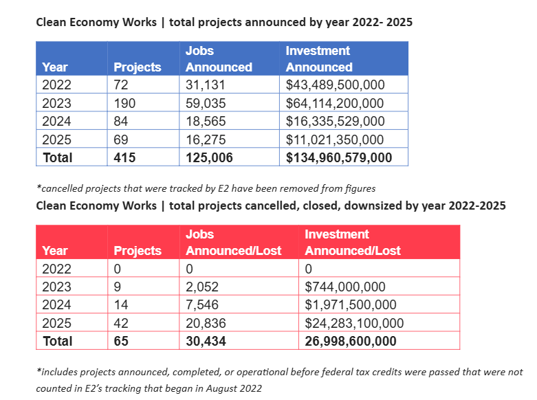 “The loss of these projects isn’t just a setback for clean energy—it’s a setback for America’s workers and competitiveness,” said Michael Timberlake, communications director, E2. “For every cancelled factory or downsized plant, behind the scenes many more projects are not being announced at all as more capital flees and businesses look overseas to invest instead. That means fewer paychecks, less local investment, and fewer opportunities for U.S. workers to lead in the industries of the future.”