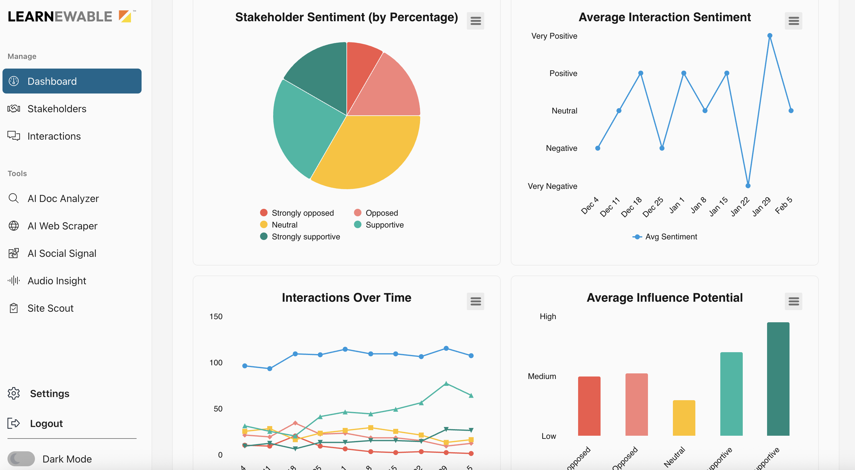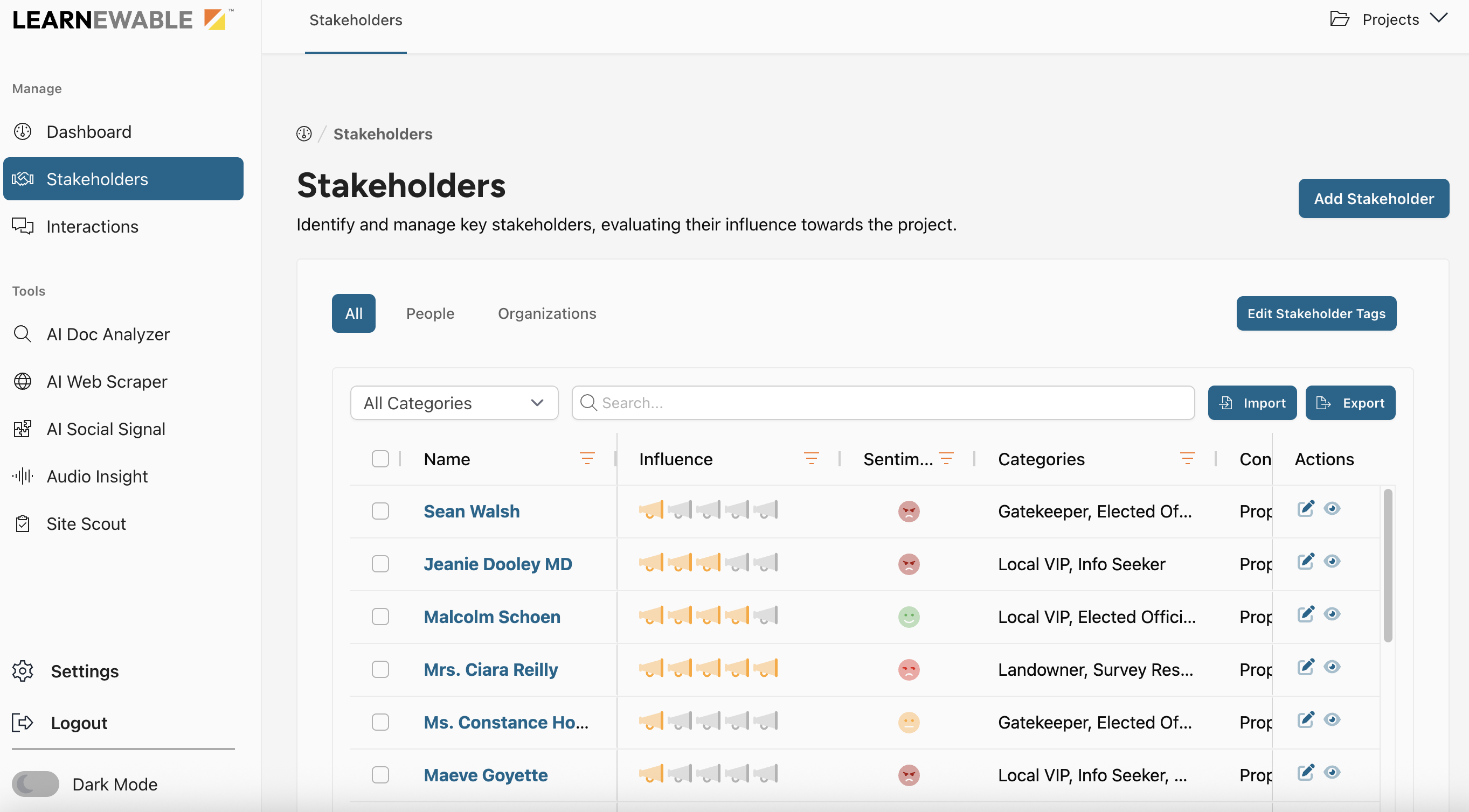 In addition to the web scraper and web tracker tools that continually monitor social media including Facebook and Nextdoor, Site Scout also has an audio and video tool that developers can use to download the text of city council, planning board or other meetings that are posted to YouTube. Called “Audio Insight,” the tool identifies stakeholders and summarizes their point of view. A proprietary algorithm, developed with a psychologist and after interviewing over 100 developers about their needs, then categorizes the stakeholders according to their potential influence.