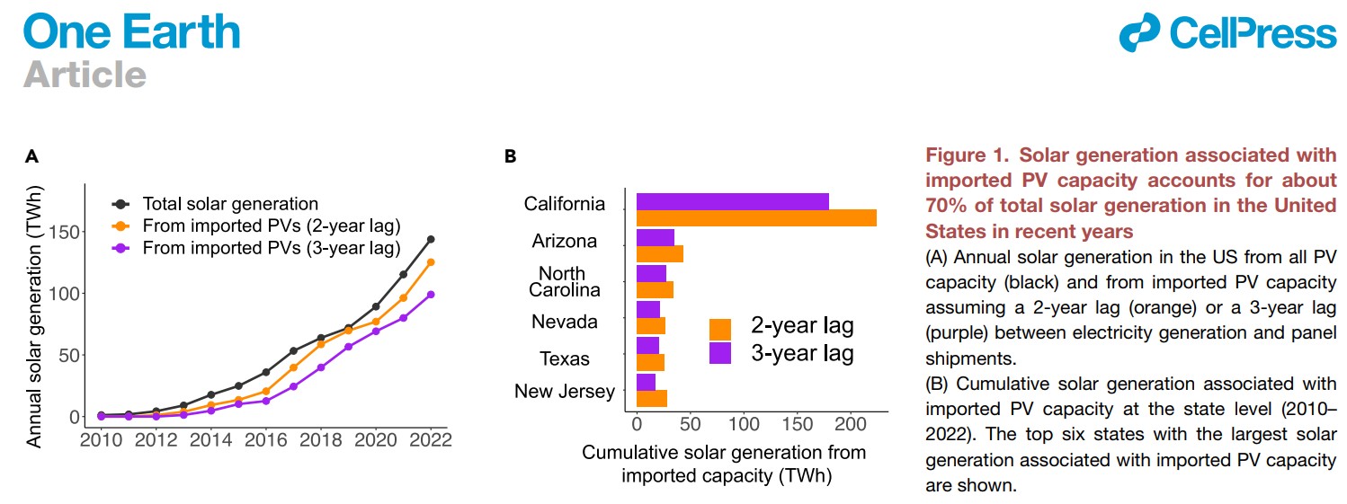 The paper, Imported solar photovoltaics contributed to health and climate benefits in the United States, showed that 78% of solar panels deployed during this time were imports. As utility-scale solar grew from “nearly zero” in 2010 to 3.4% of total U.S generation in 2022, those imported modules were critical.