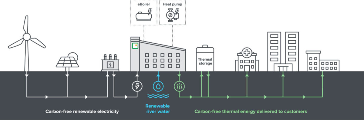The complex will use renewable energy to harvest heat from the Charles River that will go towards the production of carbon-free steam for delivery across Vicinity’s 29-mile district energy network.