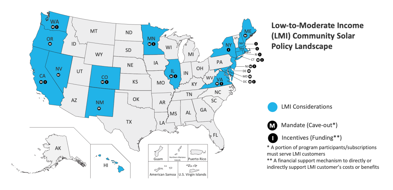 LMI solar policy is becoming more ambitious. California and New Jersey, for example, require over half of power from community solar projects to go to low-income residential subscribers. New Jersey recently added 3,000 MW to their program.