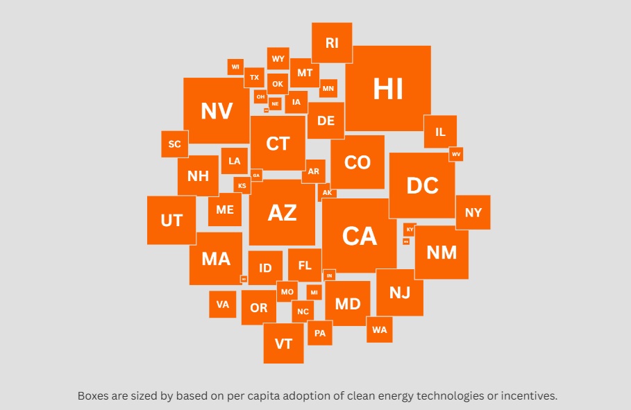 The report includes a series of charts that show the proportion of each state’s population that have taken specific steps to adopt clean energy. The chart below shows the per capita adoption of solar energy by state, with the state boxes sized according to adoption.
