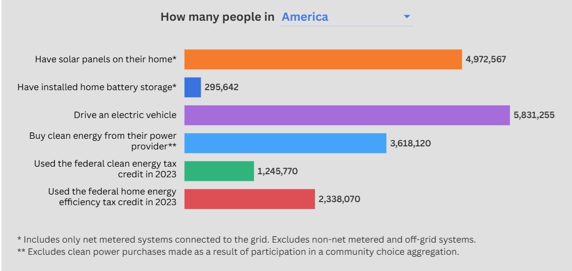 The data on residential solar and battery storage customers is based on December 2024 figures from U.S. Energy Information Administration. The number of registered electric vehicles in 2024 is derived from Alliance for Automotive Innovation, Get Connected Electric Vehicle Quarterly Report, 4th Quarter, 2024. The number of electricity customers in each state engaging in voluntary purchases of renewable electricity is based on 2023 data from the National Renewable Energy Laboratory. The number of taxpayers claiming the residential clean energy tax credit and the energy efficiency tax credit in 2023 was obtained from the Internal Revenue Service, SOI Tax Stats – Clean Energy Tax Credit Statistics.
