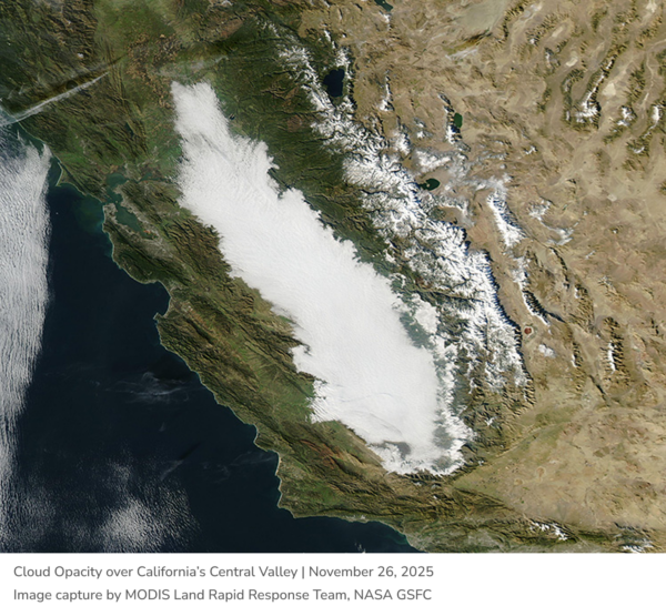 Meanwhile, the western half of the continent faced a very different scenario. November was dominated by an atmospheric river that delivered heavy rain, dense cloud cover, and widespread fog. Irradiances fell 10–20% below climatology across much of the western and northern U.S., Baja California, and parts of western Canada. Central California’s Central Valley saw the signature of “Tule fog” in the data, with anomalies plunging as much as 40% below average. This persistent instability also drove record or near-record November rainfall at several locations, reinforcing the suppression of solar resources.