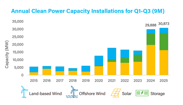 The third quarter of 2025 saw significant additions across the clean power sector. Of the 11.7 GW of total capacity added, utility-scale solar and battery storage accounted for 91% of the total, said a quarterly report from the American Clean Power Association (ACP).