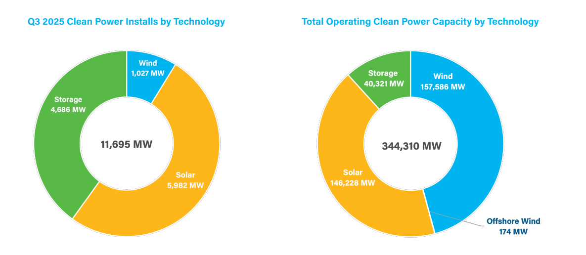 Texas remained the top state for clean power additions in Q3 2025. The state accounted for 39% of total added capacity in the U.S. during the quarter. The 63% growth in clean power capacity added by Texas in Q3 compared to Q2 was largely due to the increase in storage capacity, which the GulfStar Storage project contributed to.