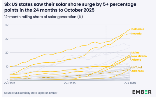 New Mexico was the fastest-growing state for solar share, rising from 7% to 17% in the 24 months ending October 2025. The report concluded that solar has the potential to meet 100% of demand growth as costs continue to fall and battery storage scales.