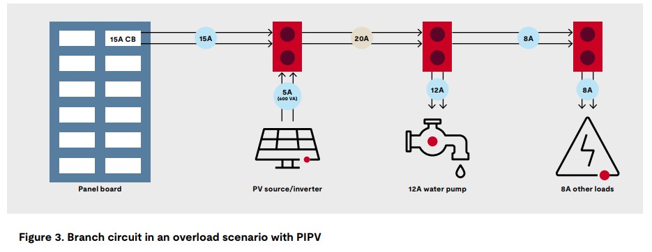 The graphic above highlights overcurrent-protection challenges, and shows how PIPV systems could enable a circuit to deliver more amperage than they are designed to handle. The electrical panel shown, with three outlets in a single circuit, is designed to allow up to fifteen amps of current. If the two connected devices — water pumps and other loads — draw their full twelve and eight amps respectively, the circuit breaker would trip, protecting the home as designed.