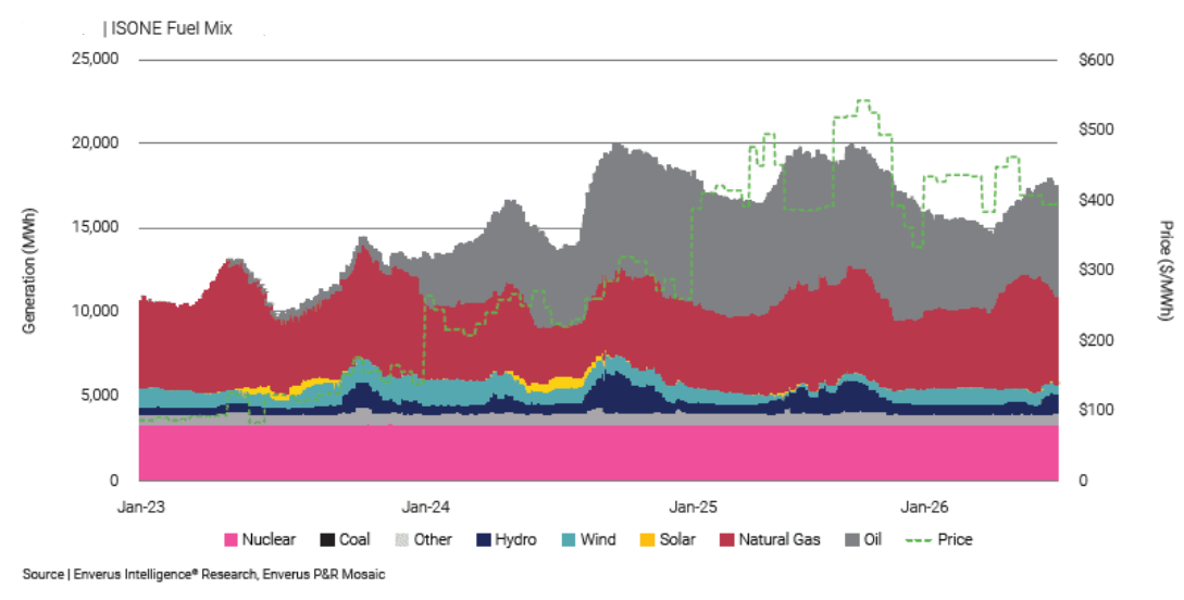 Another new Enverus report reads: “During peak cold conditions, oil and dual-fuel generation rose sharply across Northeast power markets, reaching 44% of total generation in the New York Independent System Operator (NYISO) and approximately 35% of output in ISO New England (ISO-NE), as natural gas infrastructure operated at or near full capacity and fuel flexibility narrowed.”