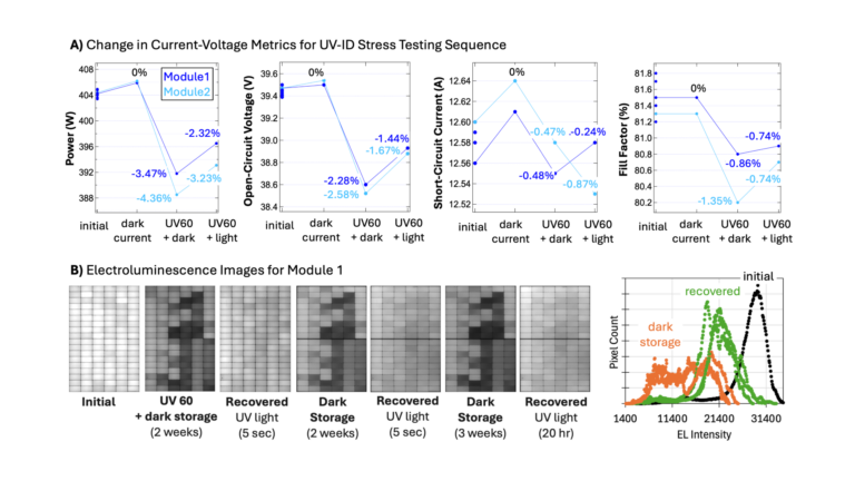 “We applied a non-destructive approach at the module level,” Kern went on to say. “With in-situ electroluminescence (EL) imaging, we watched the modules degrade during dark storage for up to 500 hours, and then we turned on UV LED flood lights and saw the modules rapidly recover within seconds to minutes. Importantly, we saw a wide distribution of how severe the dark-storage degradation was for each cell within the same module. However, all the cells had a similar time dependent response, even if the maximum severity varied from cell to cell.”