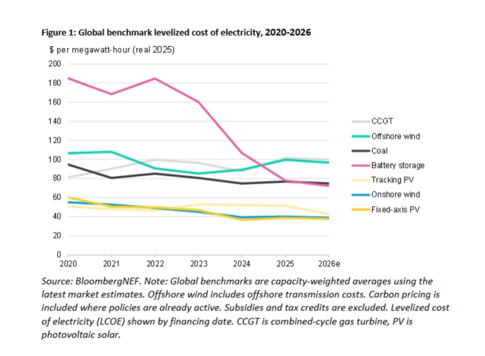The analyst’s Levelized Cost of Electricity 2026 report says that while benchmark costs for solar all rose in 2025, due to a combination of supply chain constraints, poorer resource availability and market reforms in China, innovation and competition will lead to declining costs over the next decade.