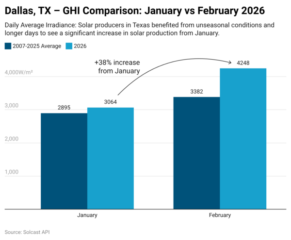 February also marked a step-change in solar conditions compared to January. Across much of the Central and Eastern United States, irradiance patterns supported double-digit solar overperformance, with increases of around 15% to 25% relative to typical February levels. ERCOT stood out within this pattern, where parts of Texas experienced exceptional solar conditions — longer days and seasonal improvements compounded with unusually clear skies to drive irradiance around 25% above seasonal norms, and +40% above January levels, as seen in Dallas, TX.