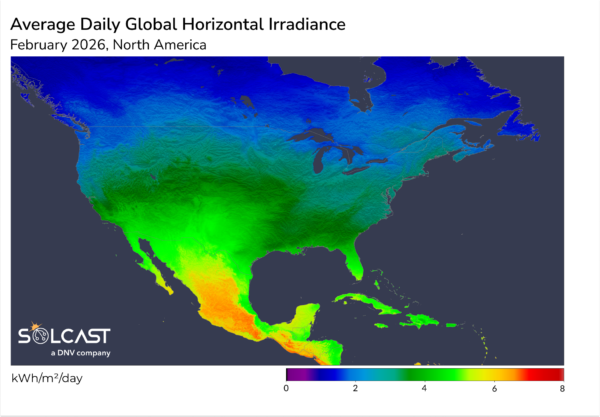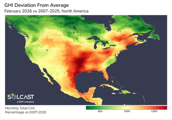 A combination of stratospheric warming and a disrupted polar vortex produced sharply contrasting irradiance patterns across North America in February, according to analysis using the Solcast API. The destabilized polar circulation produced wetter and cloudier conditions in parts of the north while keeping the central and eastern regions under clearer conditions and elevated irradiance. These opposing patterns created a clear divide in solar performance across the continent, with several inland grids experiencing stronger than normal conditions while coastal regions saw suppressed irradiance.