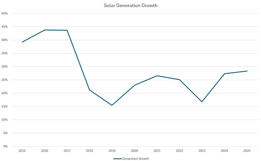 In absolute terms, 2025 solar generation growth was the highest since the 44% and 40% growth rates seen in 2017 and 2016, respectively. One significant difference from 2017, is that 2025’s growth alone 85 TWh exceeded all of the 74 TWh of electricity generated by solar in 2017.