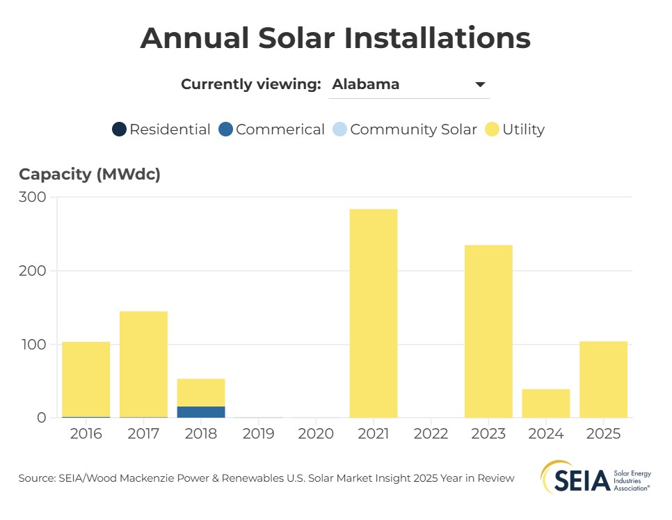 Alabama is not known for its strong solar construction, even though it is located in the south and has a large volume of land area hypothetically available. The state has just under 1 GW of capacity deployed, ranking 38th nationwide. The state gets less than 1% of its electricity from solar generation, per the Solar Energy Industries Association (SEIA).