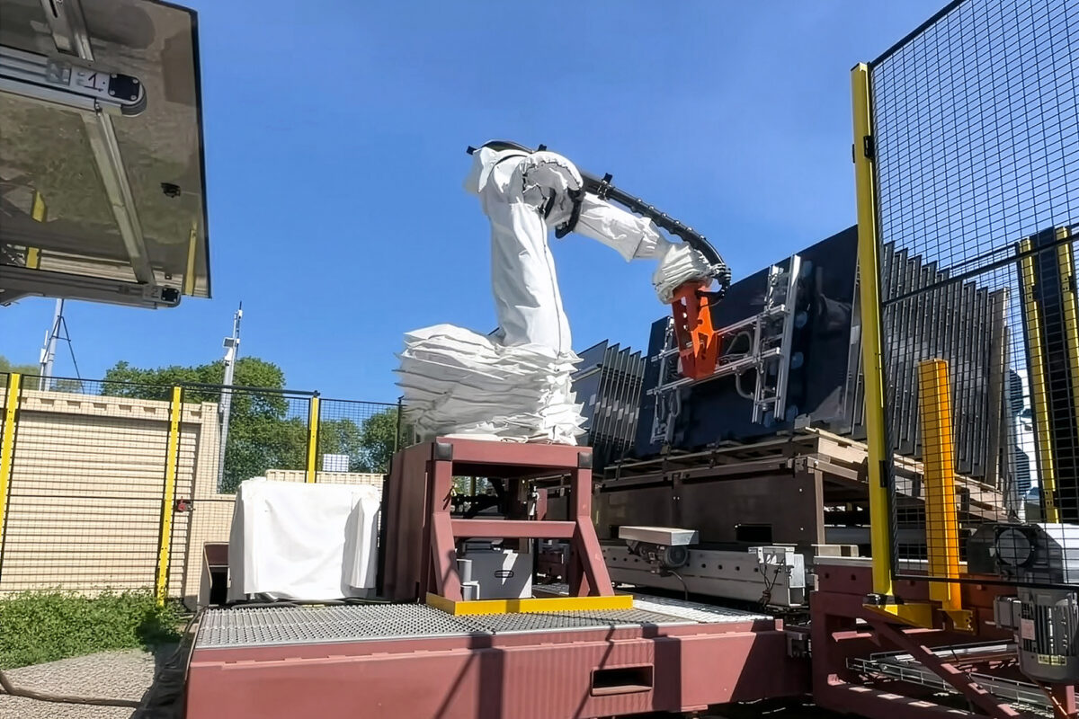 Palleted panels are paired with steel tubes and in the field and run through an automated inspection line that performs quality control. Defects are caught in real time. Robotic arms load approved assemblies from the line onto unmanned rovers that drive them out to their appointed locations in the array field for manual placement.