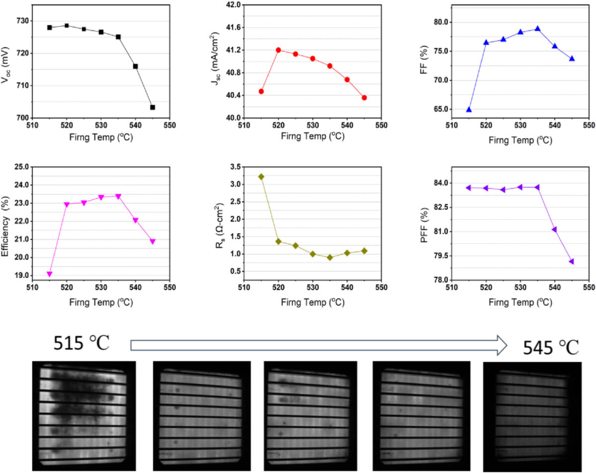 The researchers systematically optimized Cu printing and firing parameters, including screen design, firing temperature, belt speed, and LECO settings. Cells fired at 500–550 C were found to achieved stable open-circuit voltage and pseudo-fill factor up to 530 C, with degradation occurring at higher temperatures due to copper diffusion into the tunnel oxide. Moreover, short-circuit current density slightly was found to decrease at higher temperatures, while fill factor peaked around 530–535 C due to reduced series resistance (Rs). EL imaging confirmed improved contact quality with firing at 535 C, eliminating dark areas caused by poor contacts.