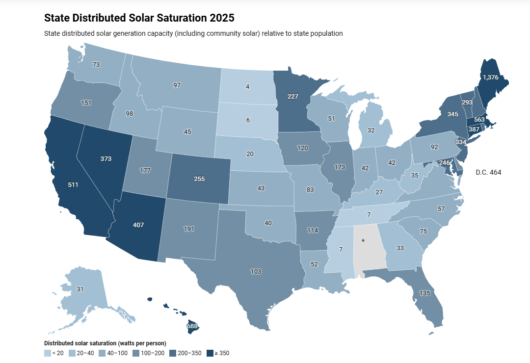 Maine surpassed other states to reach the highest distributed solar saturation in the country with 700 W per person. The state’s growth was driven heavily by community solar, which accounted for 53% of Maine’s total existing solar capacity by the end of 2025. Other states showing significant growth in distributed capacity since 2024 include D.C. at 45%, West Virginia at 30%, and Montana at 27%.