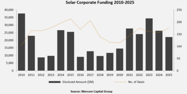 Global solar corporate funding reached $22.2 billion in 2025
