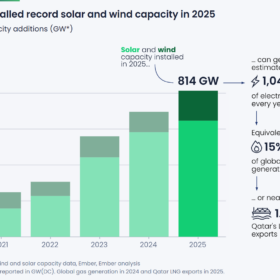 A new report from global energy think tank Ember shows 814 GWdc in new solar and wind capacity was installed in 2025, but the pace of wind deployment rose 47% year-over-year compared to just 11% for solar.
